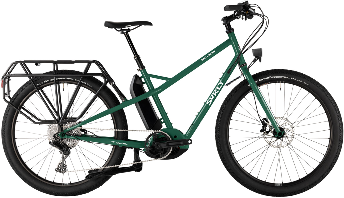 A highly useful compact electric cargo bike, Surly Skid Loader is built for heavy loads and goes where traditional long-tails can’t quite fit. Engineered to expand utility and shrink footprints, it’s ideal for cutting down on car trips and navigating tight spaces — think bus racks, packed trains, or studios without storage space. Skid Loader comes in three broad frame sizes, and it’s equipped with a robust rear rack, the option to run dual batteries for greater range, and clearance for large-volume tires. For hauling more gear over longer distances and everyday rides on whatever surface, Skid Loader rolls along, happy to oblige.